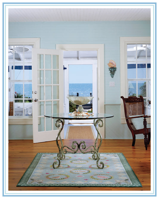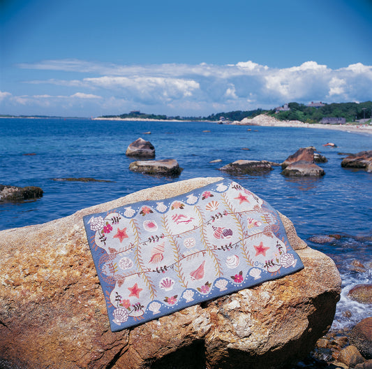 A timeless collection celebrating the beauty of seashells, featuring intricate patterns in serene ocean hues of sandy beige, seafoam green, and sky blue.