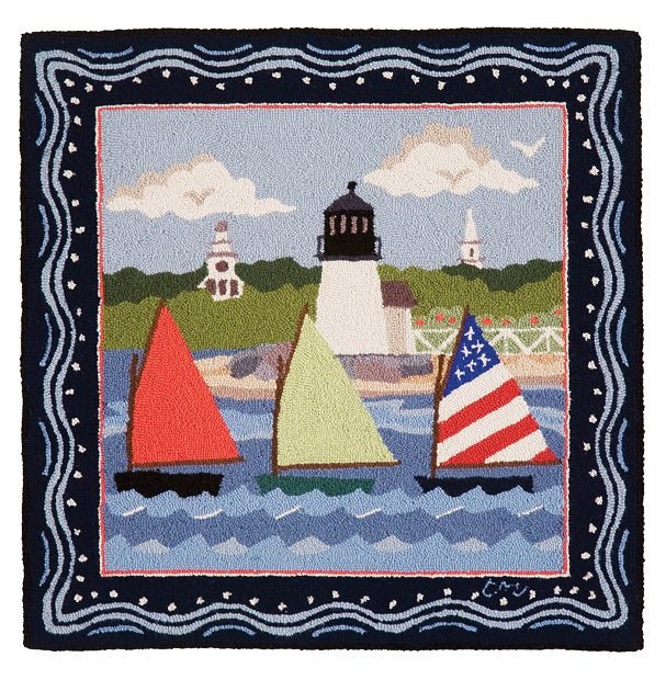 A charming scene of colorful sailboats navigating Nantucket's waters, set against a backdrop of soft blues and coastal hues, capturing the essence of seaside life.